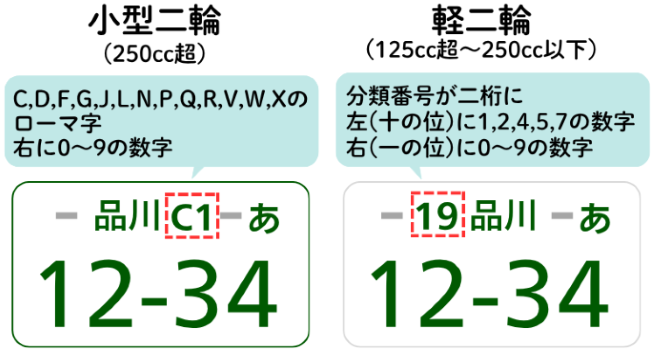 また、より多くのナンバープレートを発行するために、小型二輪では地域名の横のアルファベットの右に数字が使用され、さらにアルファベットの種類が増えます。軽二輪では今まで分類番号が二桁になり、十の位に1,2,4,5,7、一の位に0~9の数字が使用されます。