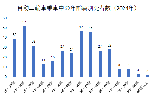 警察庁「令和6年中における交通死亡事故の発生状況及び道路交通法違反取締り状況等について」に掲載の「自動二輪車乗車中の年齢層別死者数の推移」によると、2024年に最も自動二輪車乗車中の死者が多かった年齢層は20~24歳の52人ですが、次いで多いのは50~54歳の47人、55~59歳の46人となっています。