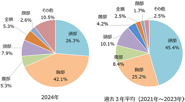 転倒時や事故時のダメージを減らすためにもウェアやプロテクターは安全性の高いものを選び、乗車時には必ず着用するようにしましょう。昔はプロテクターなしで運転していたかもしれませんが、バイク乗車中の死者の損傷主部位では頭部の他に胸部も多く、命を守るためには胸部プロテクターの着用が大切です。もちろん、できるだけダメージを減らすにはその他部位のプロテクターやグローブ、ブーツも重要です。